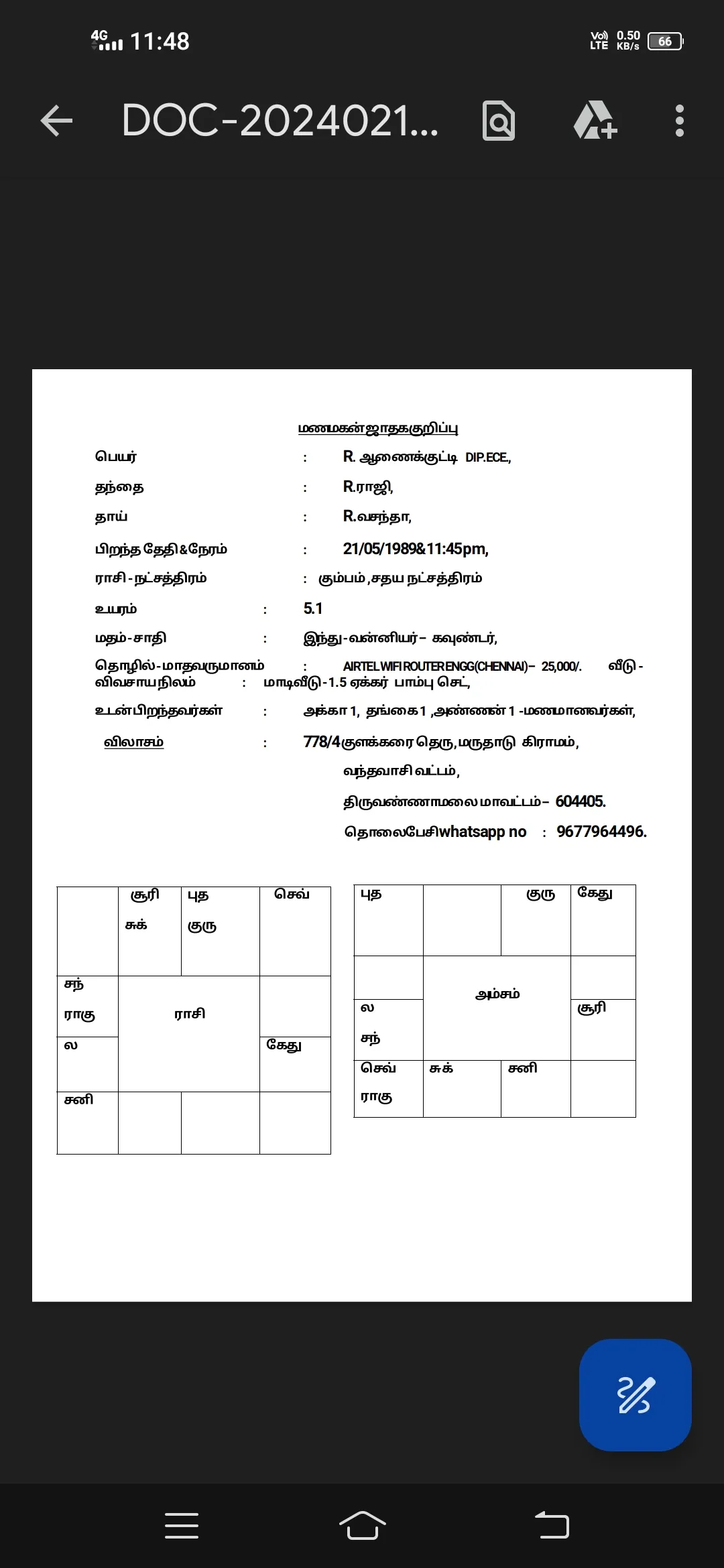 Basic information Name Anaikkutti Mobile Number Login to see the mobile number Date of birth 21 May, 1989 Address Vandavasai 604405 Tamil Nadu India Height 5ft / 152 cms Weight 53 Any Disability Normal Family Details Matrimony Profile For Myself Mother Tongue Tamil Caste Vannia Kula Kshatriyar Subcaste Any Vannia Kula Kshatriyar Marital Status Never Married Family Type Joint Family Status Upper middle class Family Values Traditional Horoscope Details Born Star Shatabhisaa / Sadhayam Lagnam Capricorn (Magaram) Gothram Siva kothiramSiva kothiram Dosham No Professional Details Employed in Private Occupation Others Annual Income 1 - 2 Lakhs Highest Education D.E.C.E Personal Information Body Type Average Diet Non Vegetarian Drink No Smoke No Horoscope