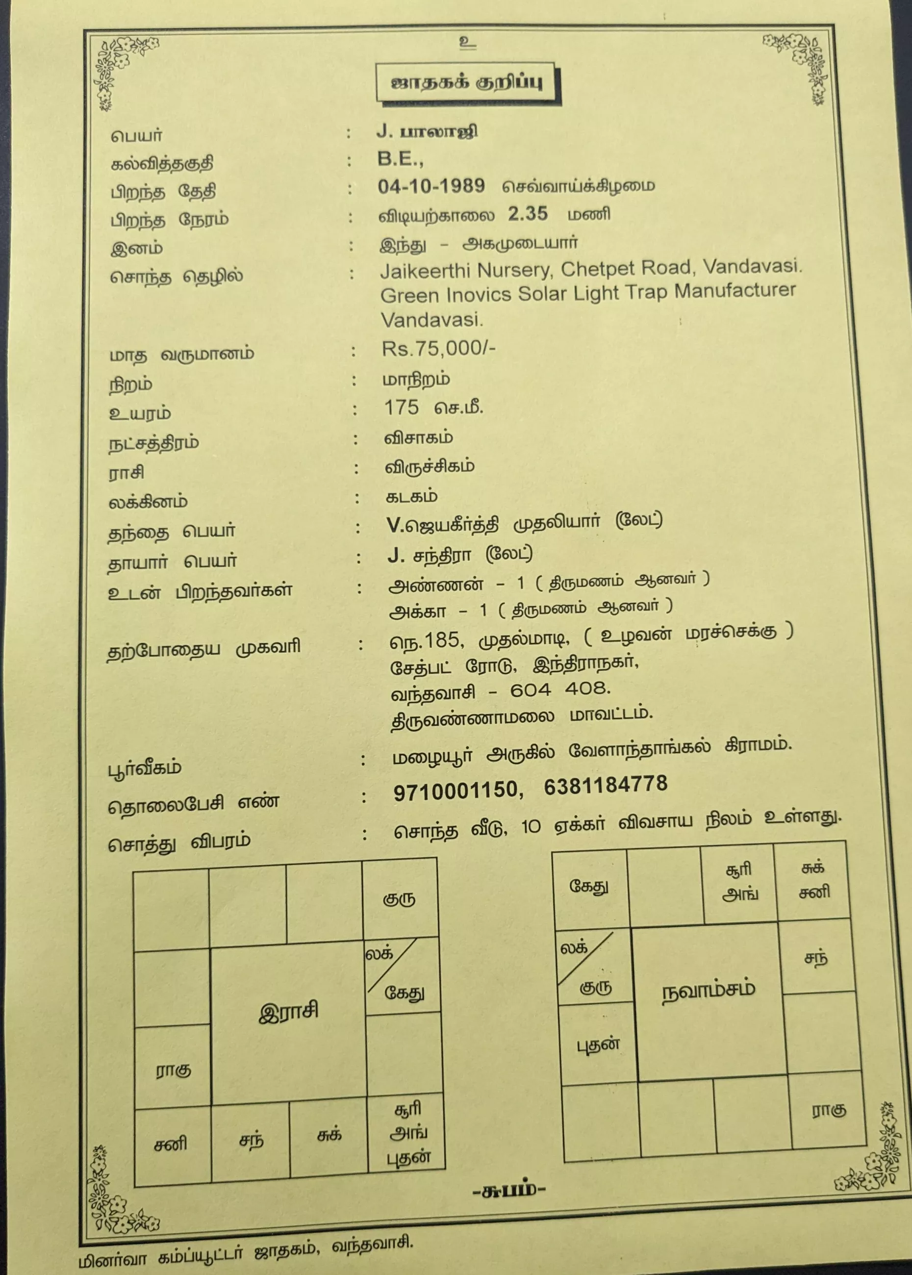 Basic information Name J. Balaji Mobile Number Login to see the mobile number Date of birth 4 October, 1989 Address Vandavasi 604408 Tamil Nadu India Height 5ft 9in / 175 cms Any Disability Normal Family Details Matrimony Profile For Myself Mother Tongue Tamil Caste Agamudayar / Arcot / Thuluva Vellala Subcaste Agamudayar Marital Status Never Married Family Type Nuclear Family Status Upper middle class Family Values Traditional Horoscope Details Born Star Vishaka / Visakham Lagnam Cancer (Katakam) Dosham No Professional Details Employed in Business Occupation Others Annual Income 9 - 10 Lakhs Highest Education B.E/B.Tech Personal Information Body Type Average Drink No Smoke No Horoscope
