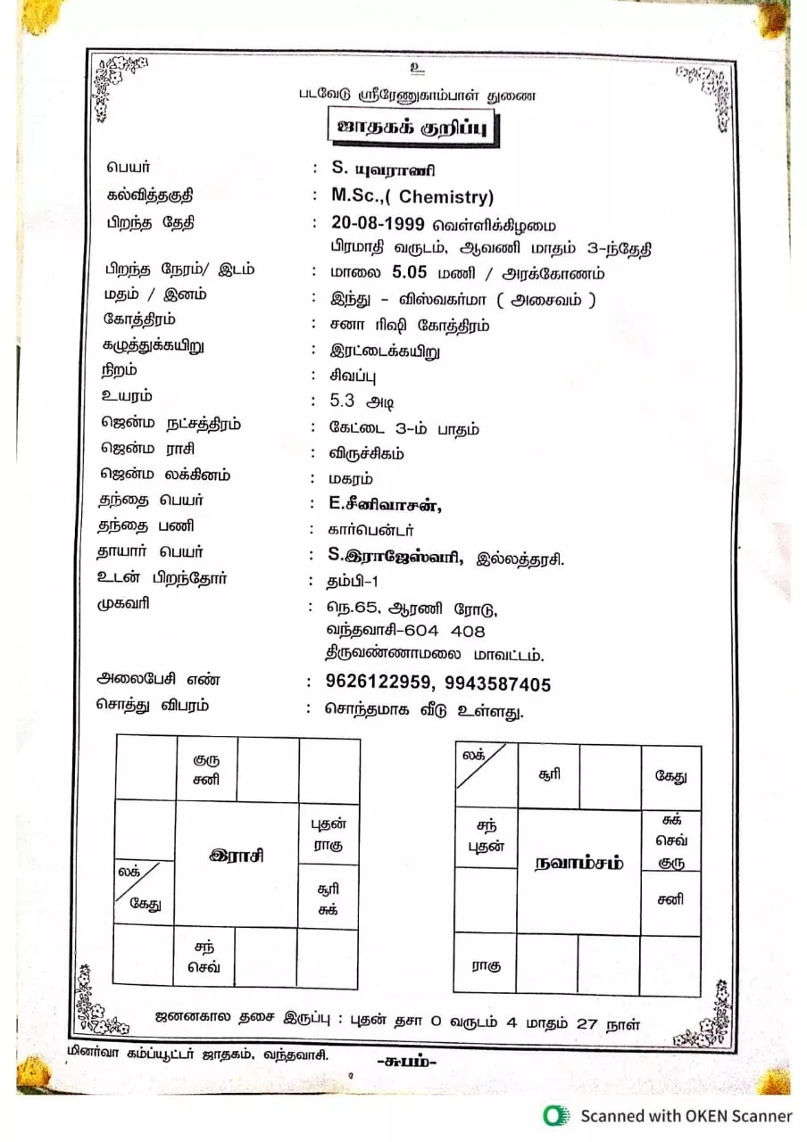 Basic information Name Yuvarani Mobile Number Login to see the mobile number Date of birth 20 August, 1999 Address Vandavasi Thiruvannamalai Dt 604408 Tamil Nadu India Height 5ft 1in / 154 cms Weight 65 Any Disability Normal Family Details Matrimony Profile For Daughter Mother Tongue Tamil Caste Vishwakarma Subcaste Kammalar Marital Status Never Married Family Type Nuclear Family Status Middle class Family Values Moderate Horoscope Details Born Star Jyeshta / Kettai Lagnam Scorpio (Virushikam) Gothram Janarishikothram Dosham No Professional Details Employed in Private Occupation Others Annual Income 0 - 1 Lakh Highest Education M.Sc. Personal Information Body Type Average Diet Non Vegetarian Drink No Smoke No About Details About Yourself & Family படித்த நல்ல வேலையில் உள்ள மணமகன் Horoscope
